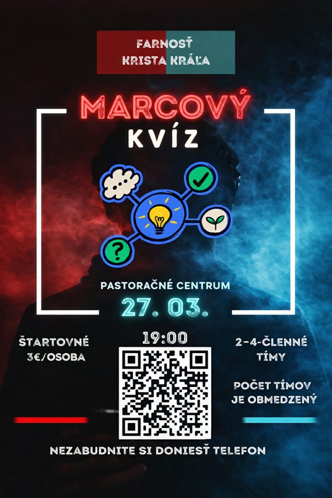 - Pozývame vás na kvízový večer – 27.3.2026 o 19:00 v pastoračnom centre. Nezabudnite si priniesť mobilný telefón alebo tablet. Registrácia a bližšie informácie nájdete na farskej stránke a na plagáte.